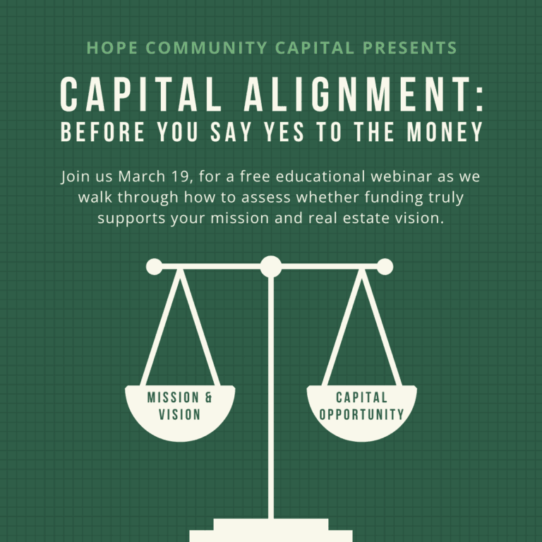 In this free educational webinar, Carrie Sanders, Founder & CEO of Hope Community Capital, will walk through the Capital Alignment framework HCC uses with clients across the country to evaluate and structure funding sources before commitments are made.